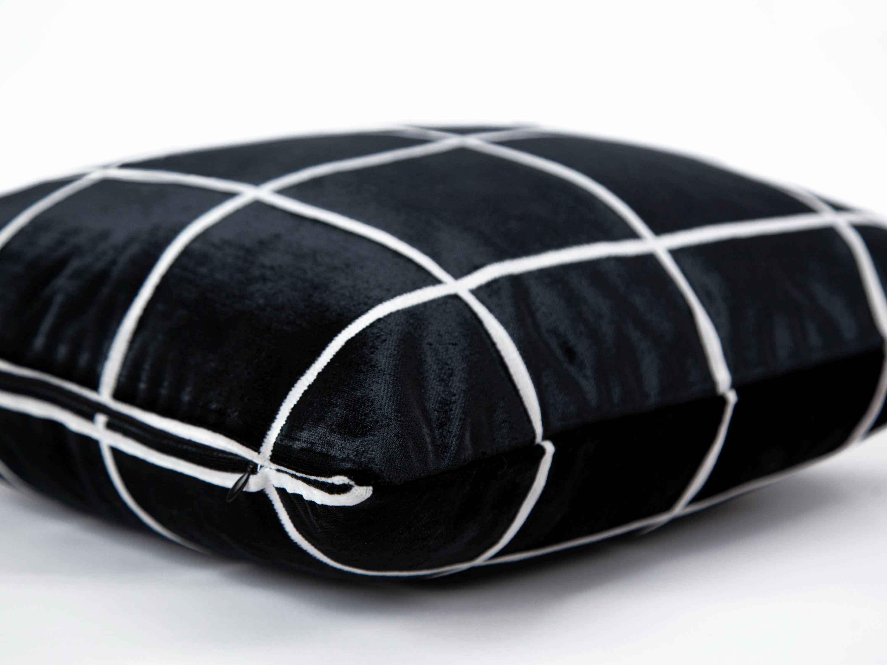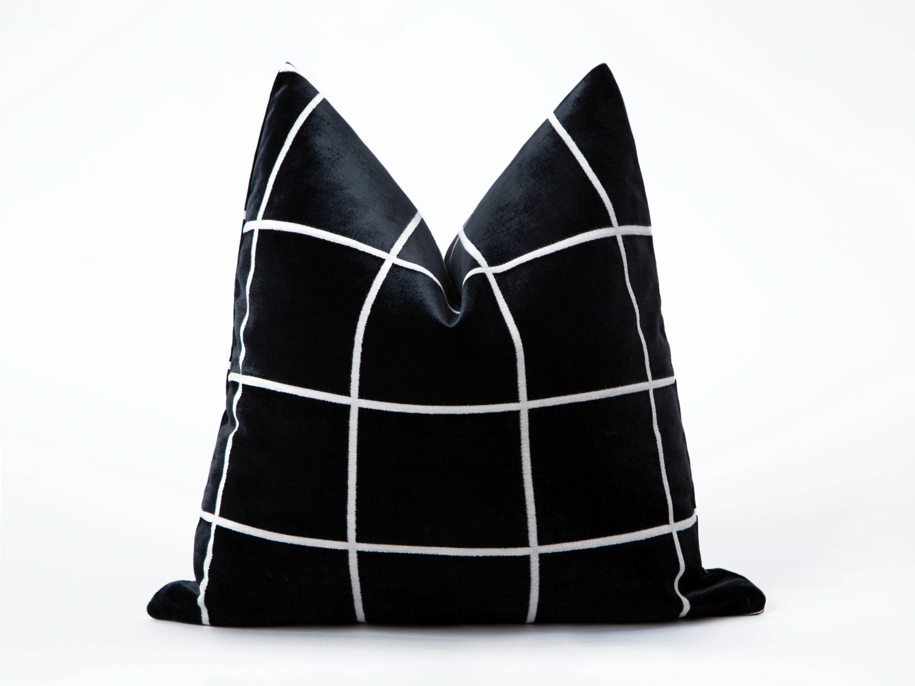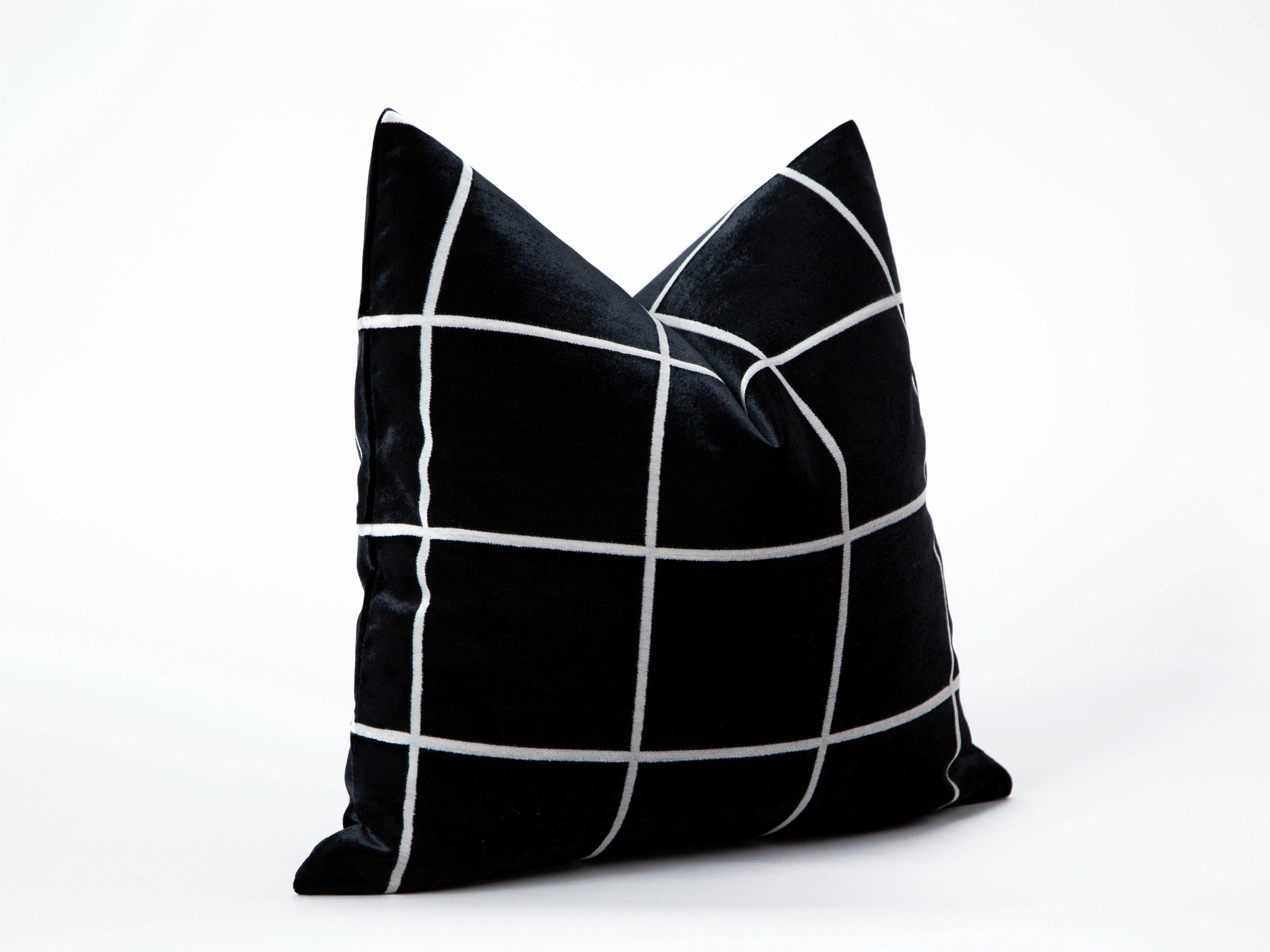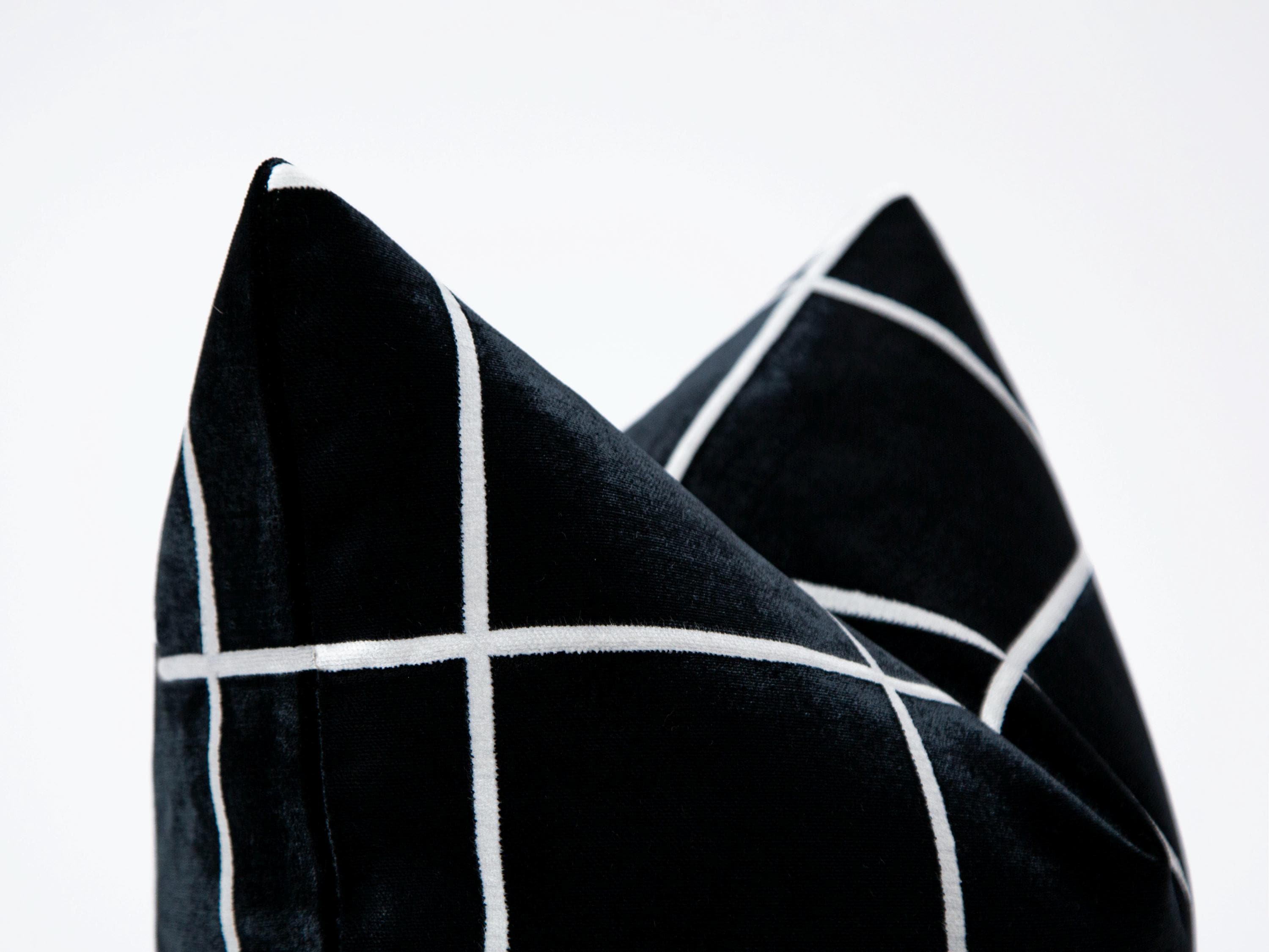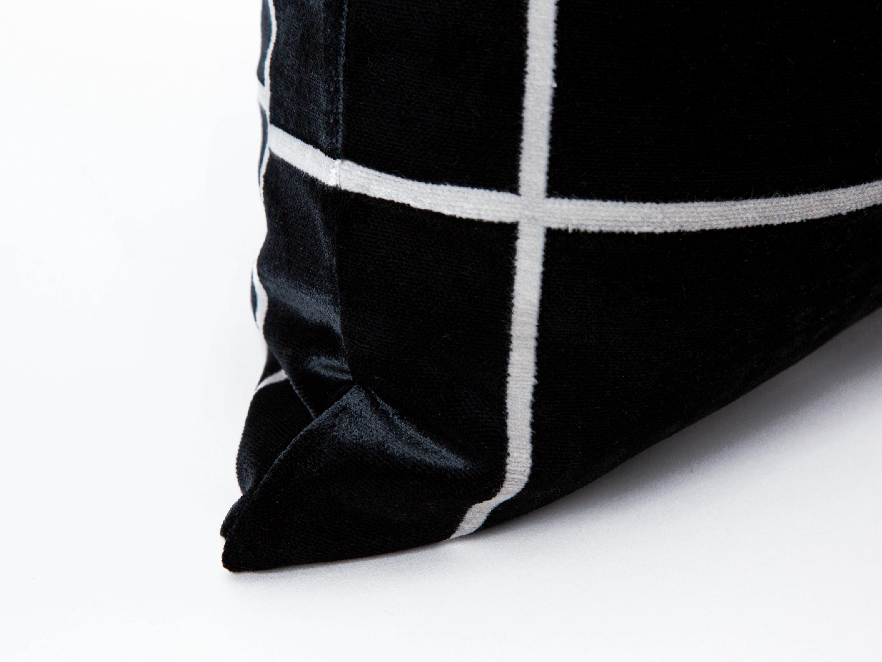 Elevate your home decor with this luxurious black velvet pillow cover featuring a sleek white grid pattern. This pillow cover is an ideal choice for anyone looking to add a touch of elegance to their living space.