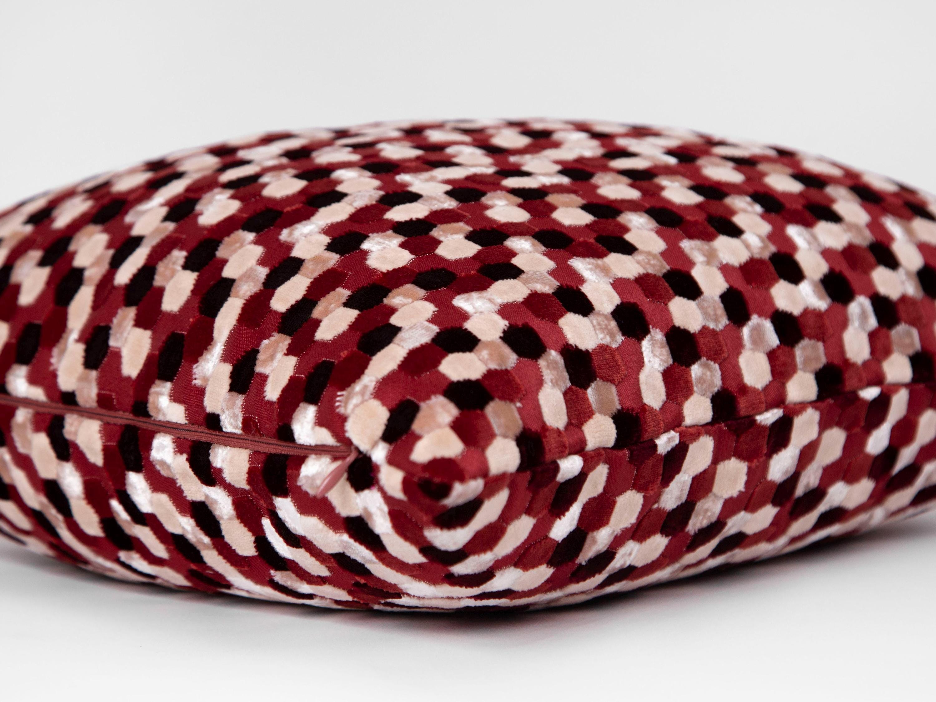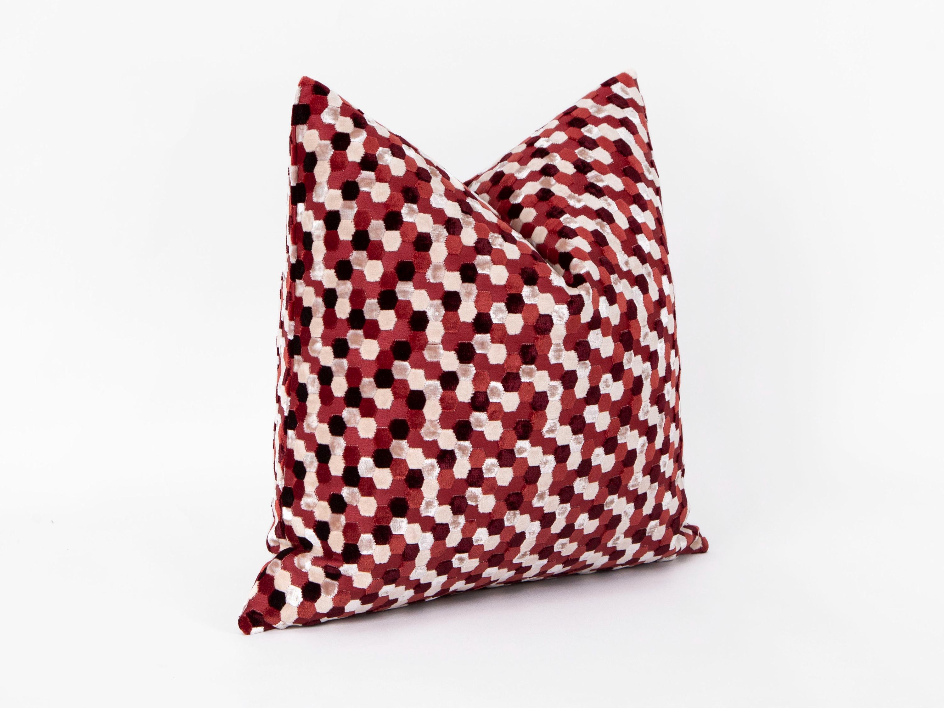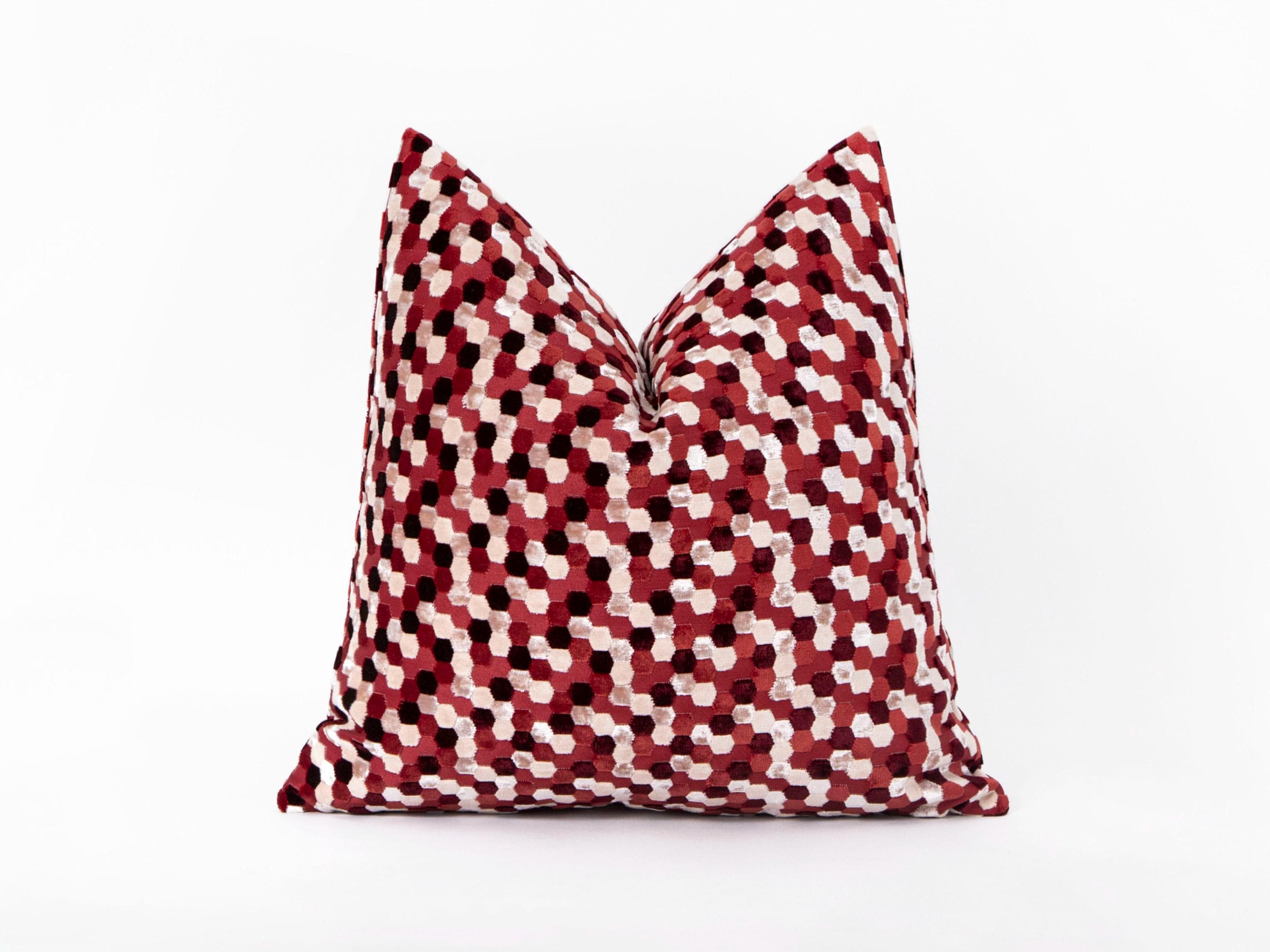 Enhance your home decor with this elegant geometric velvet pillow cover in a striking red and cream hexagon design. Perfect for adding a luxurious touch to your couch, living room, or bedroom!